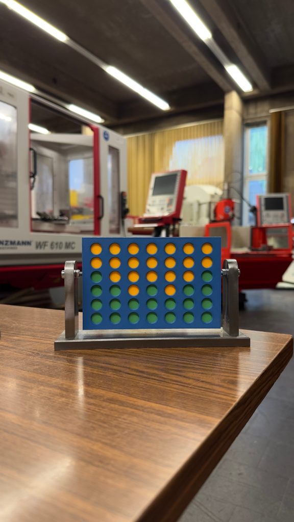 An dësem Kontext hunn d’Schüler hiert Wëssen an hir Kompetenzen an d’Praxis ëmgesat, andeems si eng Grondplack souwéi Säitendeeler mat Feilen, Gewindeverbindungen a Passstëft-Verbindungen hiergestallt hunn. A Kombinatioun mam 3D-Drock ass doraus dat bekannte Spill „4 gewinnt“ entstanen.
