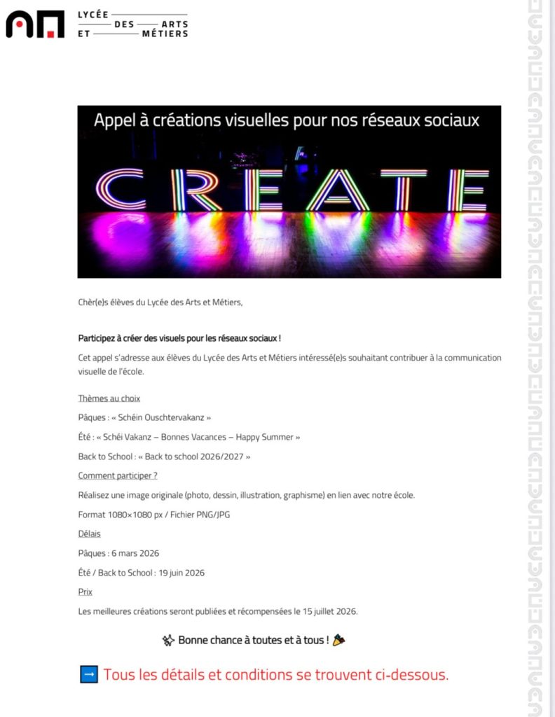 Cet appel à créations s’adresse exclusivement aux élèves du Lycée des Arts et Métiers.