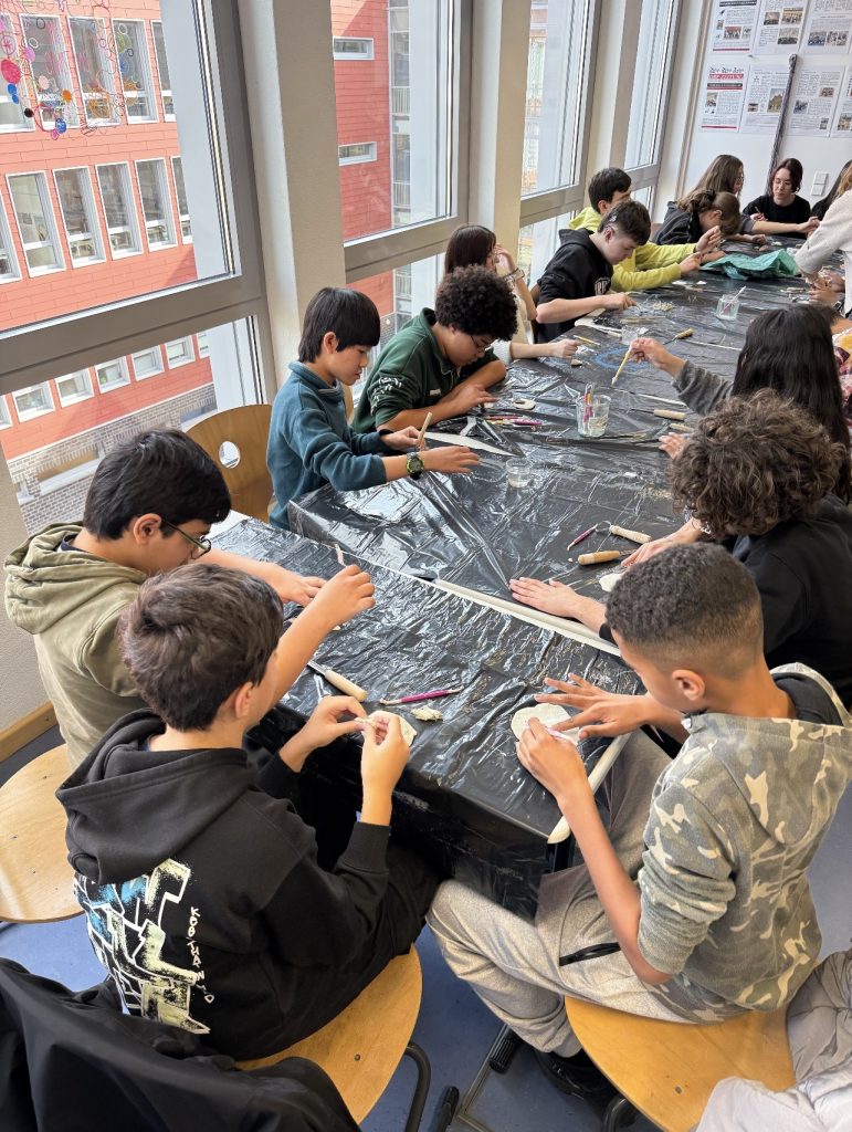 Am Montag nach den Ferien haben die 6P, die 7P5, Frau Rausch, Frau Martins und zwei Schüler aus der Logo im Klassensaal der 6P mit Lehm gearbeitet.