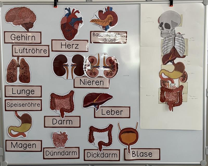 Am 8. Januar 2026 lernten die Klassen 7P5 und 7P6 die Organe des menschlichen Körpers kennen. Zunächst wurden die einzelnen Organe benannt und gemeinsam definiert. Anschließend bastelten die Schülerinnen und Schüler in Zweiergruppen ein aufklappbares Organmodell. Dabei mussten sie eine Anleitung lesen (Leseverstehen) und das Modell entsprechend selbstständig zusammenstellen.