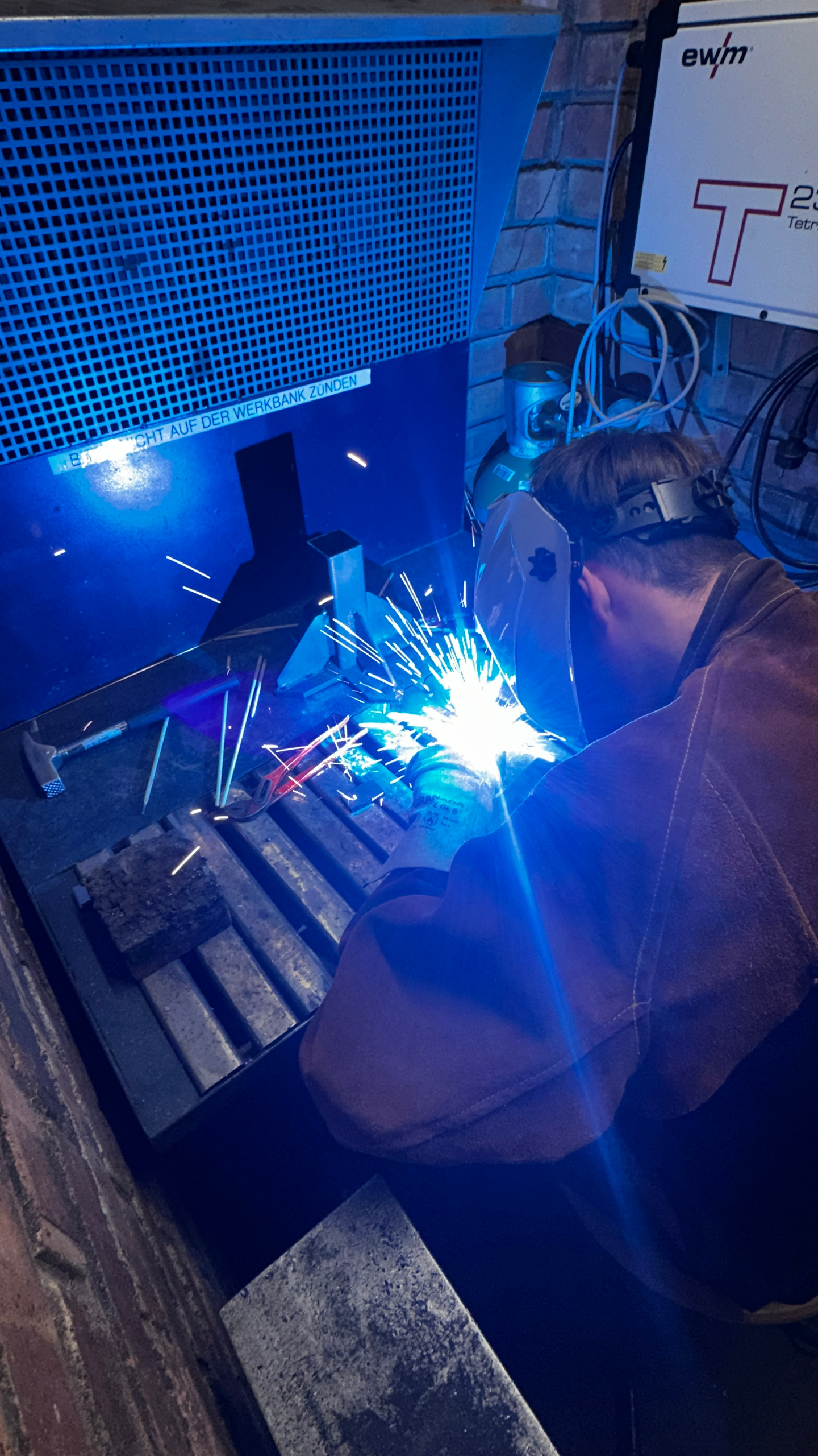 Op de Biller gesäit ee Schüler aus der DC2MI, déi verschidde Schweessverfahren uwende fir hiert Prüfungstéck (Aufstellbock) Schrëtt fir Schrëtt ëmzesetzen. 🛠️